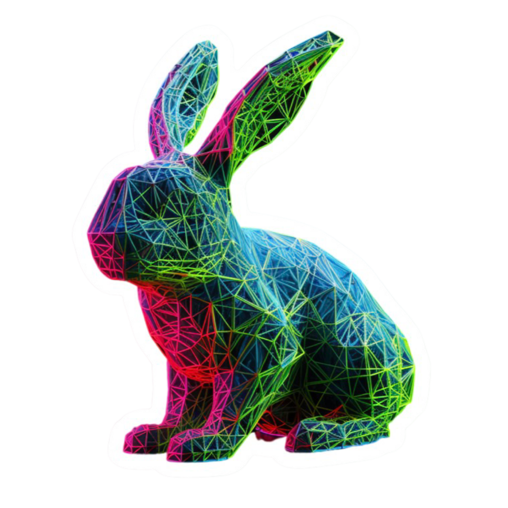 Brighten up your creative workspace with this striking neon wireframe 3D bunny sticker! A vibrant nod to the well-known Stanford Bunny model, this lively design showcases the intricate geometry of a beloved icon in the graphics programming world. Let this radiant rabbit illuminate your path as you craft stunning visualizations and hop your way to the cutting edge of computer graphics.